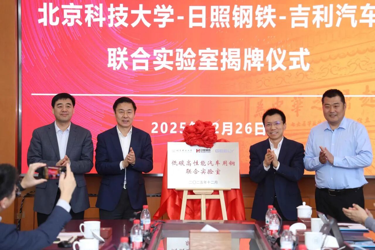2025年12月26日,学校与日照钢铁控股集团有限公司(以下简称“日照钢铁”)、吉利汽车集团有限公司(以下简称“吉利汽车”)三方共建的低碳高性能汽车用钢联合实验室揭牌仪式在学校举行。学校副校长张卫冬,中国工程院院士、碳中和研究院院长、碳中和学院院长毛新平,日照钢铁总经理徐现鹏,吉利汽车副总裁李传海等出席签约仪式。仪式由学校科技成果转化研究院副院长王晓晨主持。
