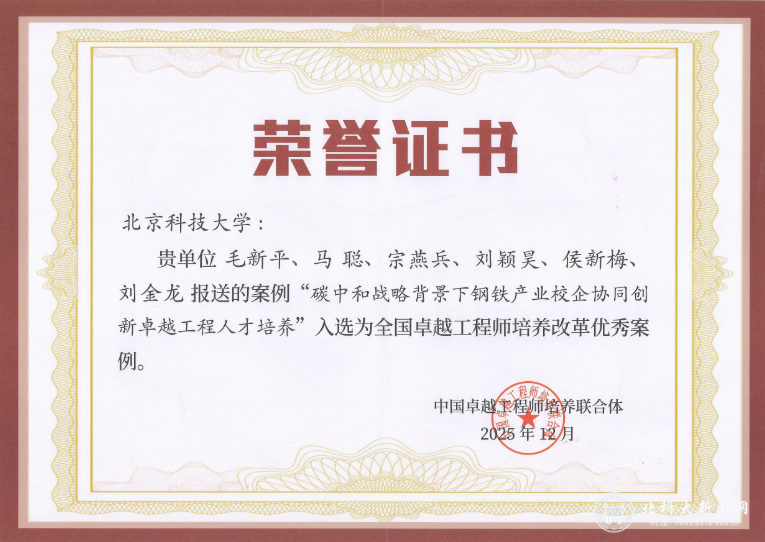 12月4日,卓越工程师培养改革座谈会在北京召开,随后教育部召开卓越工程师产教融合培养工作推进会,会上颁发了2025年全国卓越工程师培养改革优秀案例证书。我院毛新平院士牵头,与中国宝武钢铁集团有限公司首席研究员刘颖昊等合作申报的《碳中和战略背景下钢铁产业校企协同创新卓越工程人才培养》成功入选本年度优秀案例。